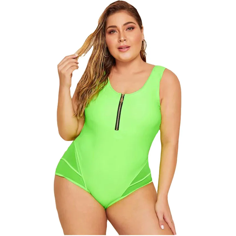 2020 New Solid Zipper Piece Swimsuit Sexy Neon Green Bodysuit Female