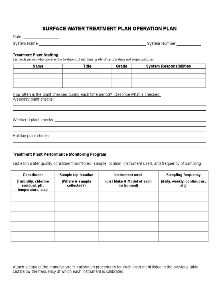 Surface Water Treatment Operations Plan Template PDF Water