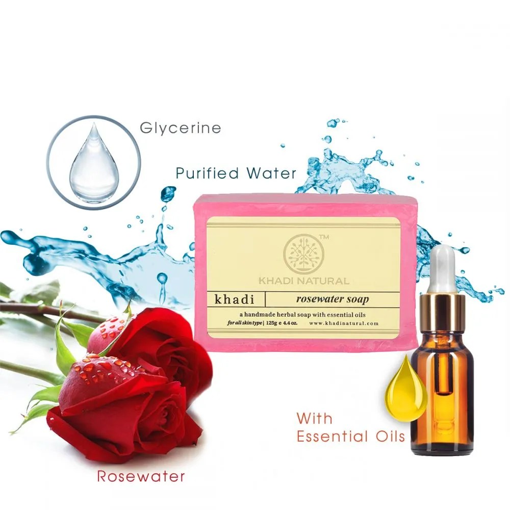 Khadi Natural Rose Water Soap at Rs 81/piece Khadi Pure Herbal Soap Khadi Rose Water Soap Benefits Crafted with care, this soap combines the soothing properties of rose water and the therapeutic benefits of herbal ingredients. Khadi care rose water soap has the goodness of rose petal water and glycerin that keeps your skin smelling heavenly along with keeping it. Khadi natural rose water soap has the goodness of rose petals water and glycerin that keeps. Read. Khadi Rose Water Soap Benefits.