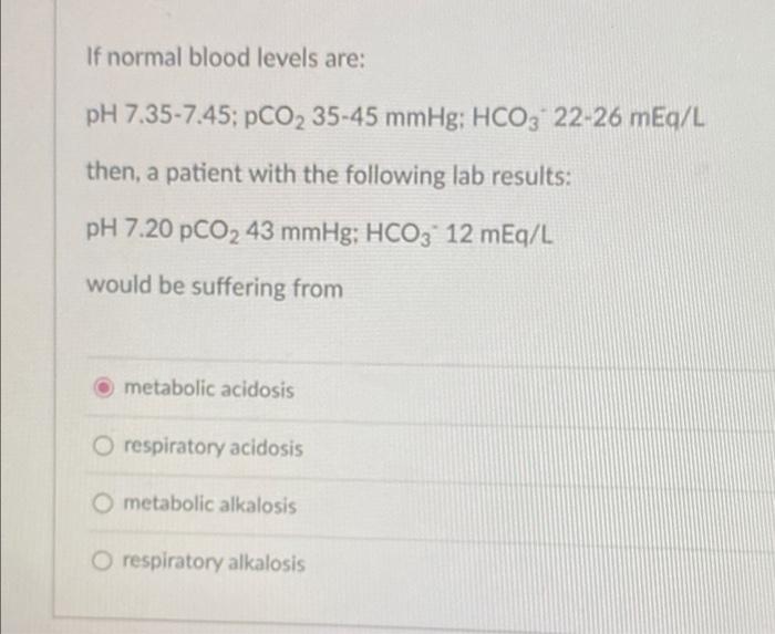 Solved If normal blood levels are pH 7.357.45; PCO2 3545
