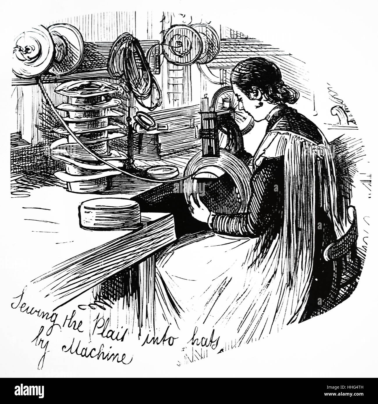 Sewing strips of plaited straw together by machine to form hats. Luton