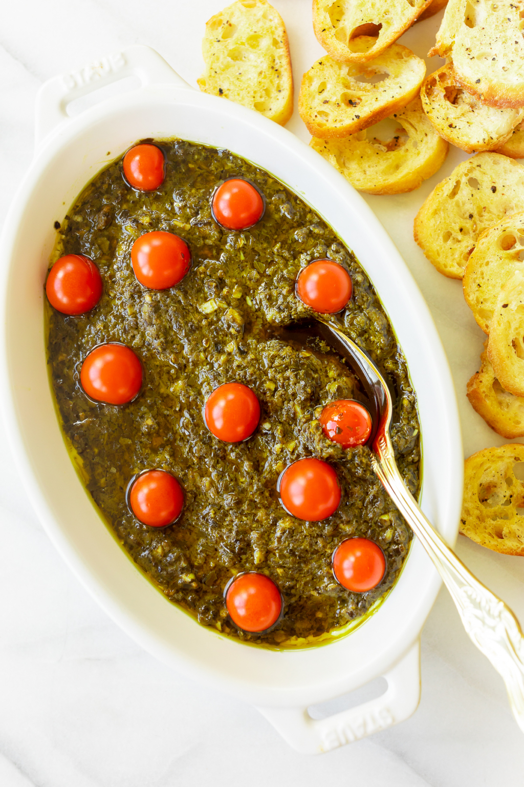 This easy appetizer can be served warm, cold, or at room temperature for any occasion. Topped with mozzarella for the perfect cheesy bite every time you dip. Preheat oven to 350 degrees f. Scoop half the jar of pesto on top. Spread the pesto over the top of the cream cheese in a nice even layer. Slice all of the tomatoes in half and spread over the top of the pesto. In a loaf pan or dish, spread out the two blocks of cream cheese in an even layer. All you need is cream cheese and pesto! Bake for 20 to 30 minutes until the. Packed with tons of flavour from pesto, spices, sundried tomatoes in a cheesy base of cream cheese.