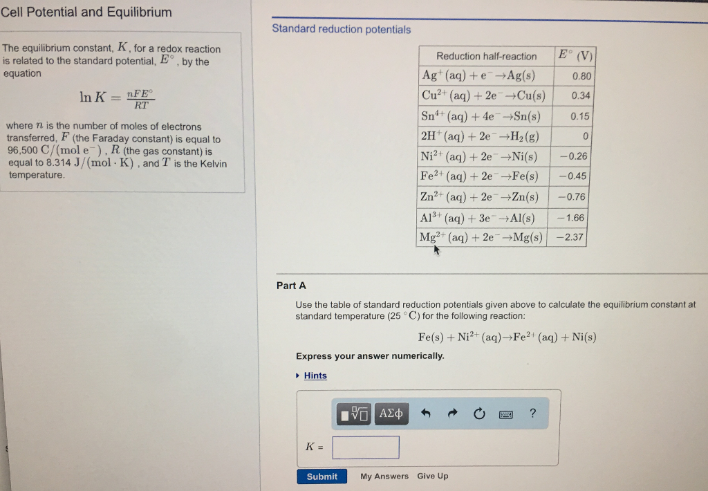 SOLVED What is the equilibrium constant K for a redox reaction that Equilibrium Constant Redox Reaction an introduction to redox equilibria and electrode potentials. the equilibrium constant for a redox reaction can be calculated using the nernst equation: Nernst equation to find equilibrium constant. the equilibrium constant of an electrochemical cell's redox reaction can be calculated using the nernst equation and the relationship between standard cell potential and free energy. This example problem. Equilibrium Constant Redox Reaction.