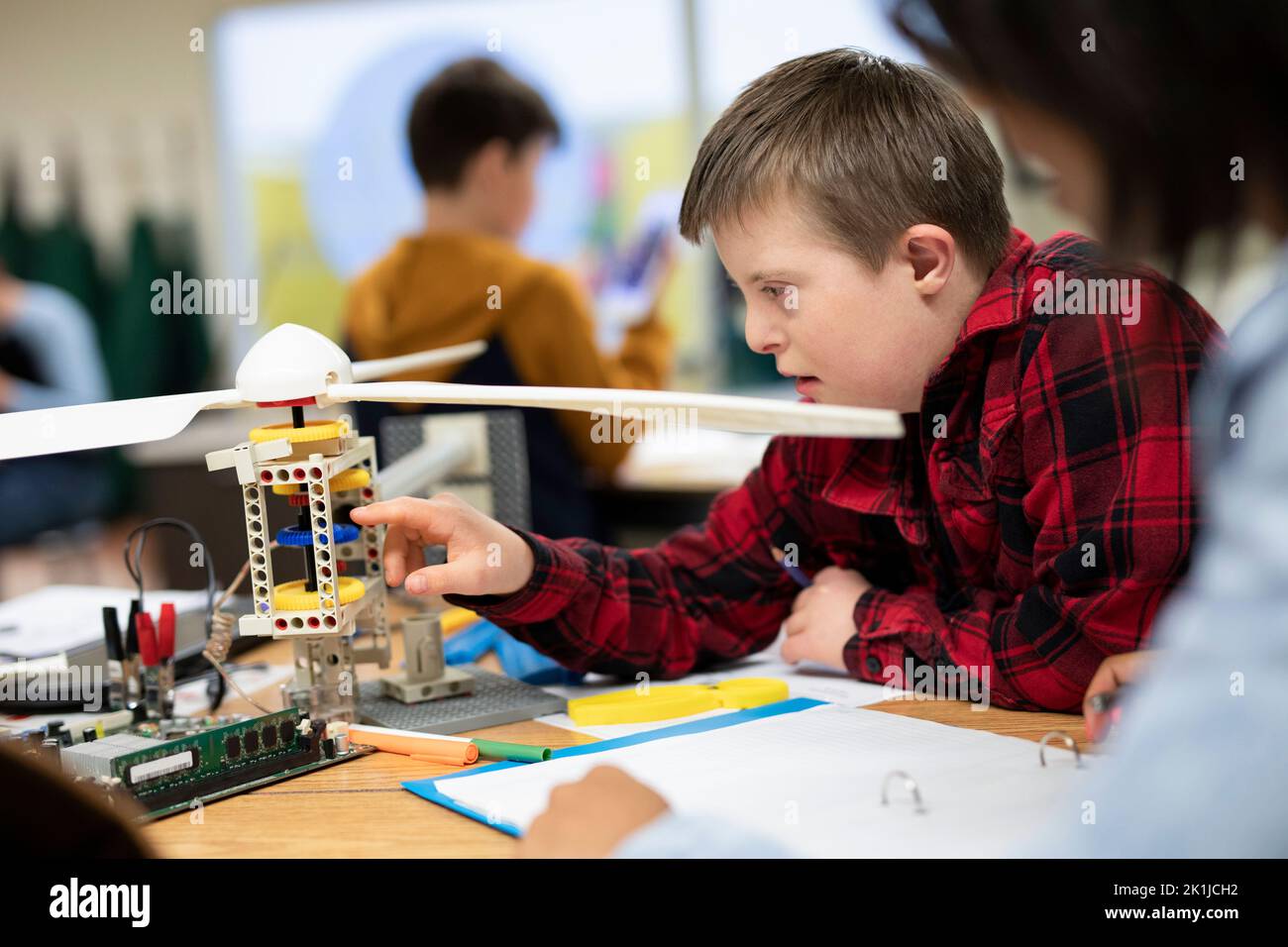 Focused junior high boy with Down Syndrome assembling wind turbine in