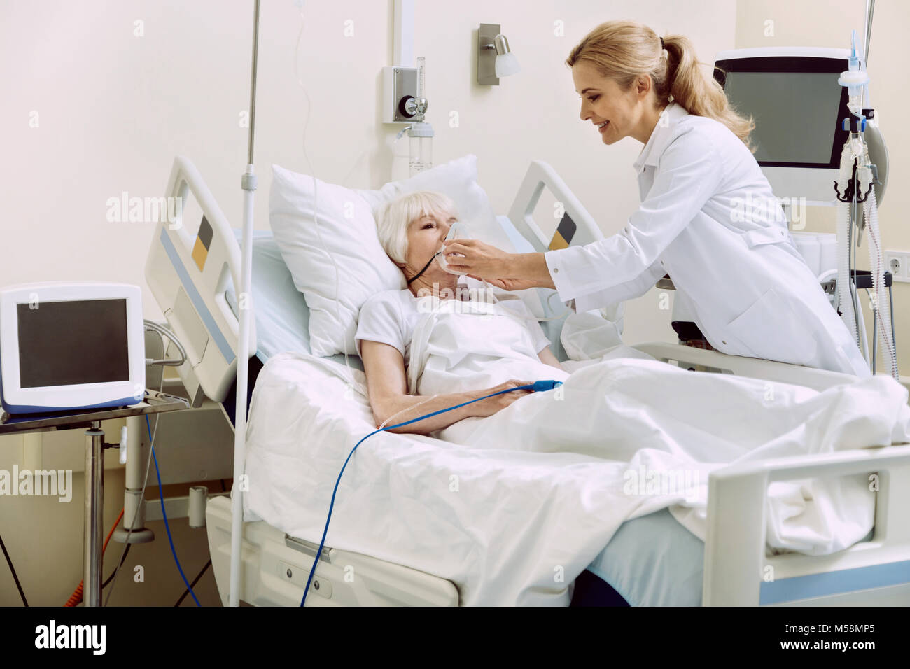 Smiling physician adjusting respiratory support at hospital Stock Photo