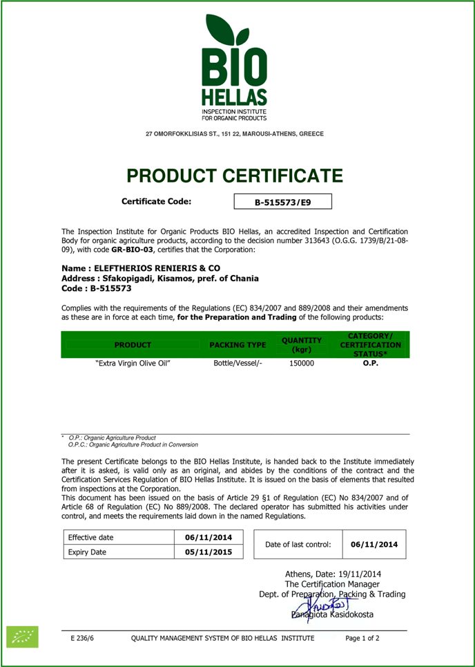 El Renieris & Co Greek Olive Oil Exports Olive Oil Certifications