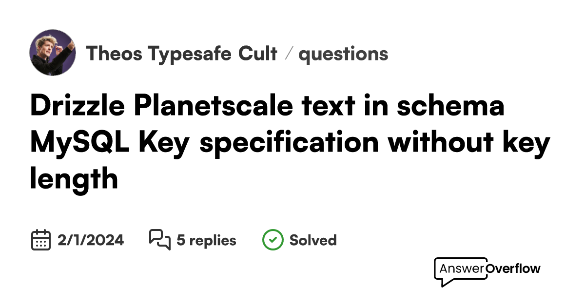 Drizzle "text" in schema (MySQL) "Key specification without Key Specification Without A Key Length Learn how to handle index key specification without a key length and key was too long errors in mysql and mariadb. Blob/text column ‘field_name’ used in key specification without a key length. I've already checked mysql error: Primary key is a unique index. Unique is an index and a uniqueness constraint. So, when using blob or text types as an.. Key Specification Without A Key Length.