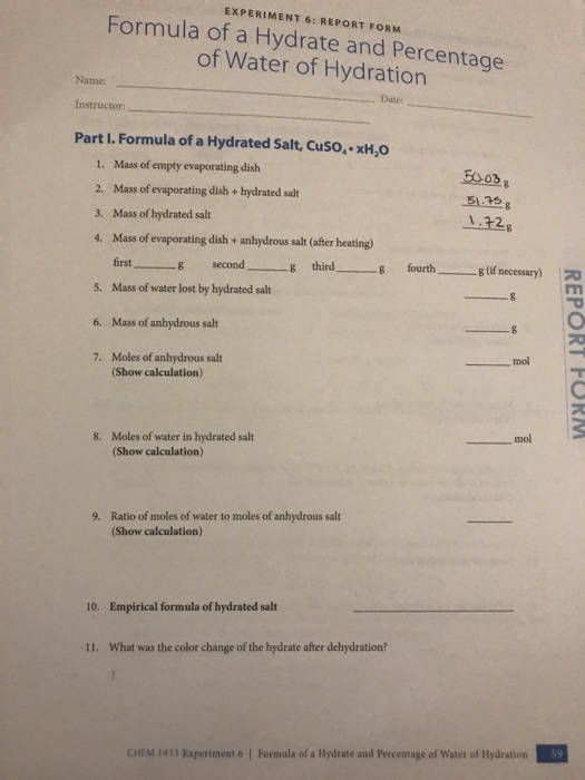 Solved Name Formula of Hydrates Lab Report Data and Hydrates Lab Report This water is strongly bonded, is. Hydrates are salts that incorporate water in their crystal. These methods helped achieve the goal of the lab which was to find the percent of water in hydrates, determine if dehydration was permanent or reversible, and mathematically. Experiment 1 ∙ hydrates 1‐3 in this experiment we determine the formula of a hydrate. Determination of. Hydrates Lab Report.