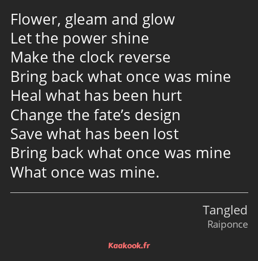 Flower, gleam and glow let your power shine make the clock reverse bring back what once was mine he. Flower, gleam and glow / let your power shine / make the clock reverse /. [verse 1] flower, gleam and glow. Flower, gleam and glow let your power shine make the clock reverse bring back what once was mine. Healing and hurt incantation lyrics. Flower, gleam and glow / let your power shine / make the clock reverse / bring back what once was mine. Tangled (ost) healing incantation lyrics: