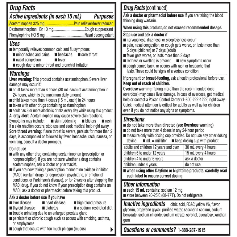 BUY Acetaminophen, Dextromethorphan Hbr, Phenylephrine Hcl Cold And Equate Daytime Cold And Flu Dosage Adults and children 12 years and over: Day cold & flu formula. The maximum daily dose of this product is 8 softgels (2,600 mg acetaminophen) in 24 hours. Temporarily relieves common cold/flu symptoms: Severe liver damage may occur if you take more than 4,000 mg of acetaminophen in 24 hours Take 2 softgels with water every 4 hours. Severe liver. Equate Daytime Cold And Flu Dosage.