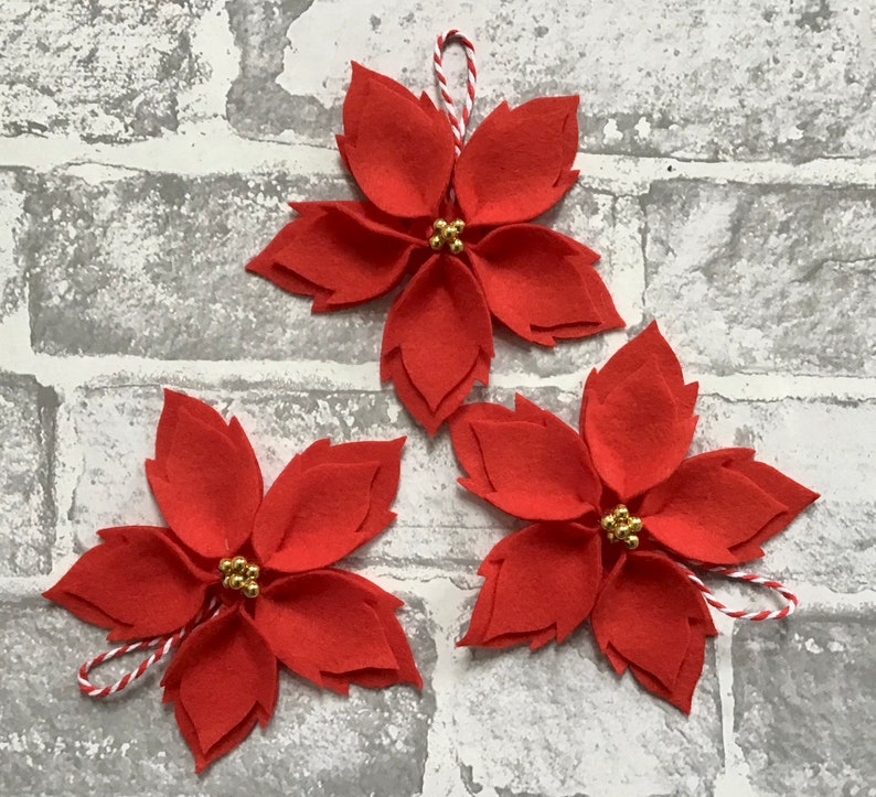 Handmade Christmas Red Flower Poinsettia Decorations Felt Etsy Handmade Poinsettia Decorations Dress up your home with poinsettia decor for the holidays that goes beyond a simple pot with a red bow. Today, i am going to take you on a crafting adventure transforming humble foil pans into gorgeous diy poinsettias. These faux flowers are perfect for a. I strung three poinsettia’s together for a unique piece of art i can display. Handmade Poinsettia Decorations.