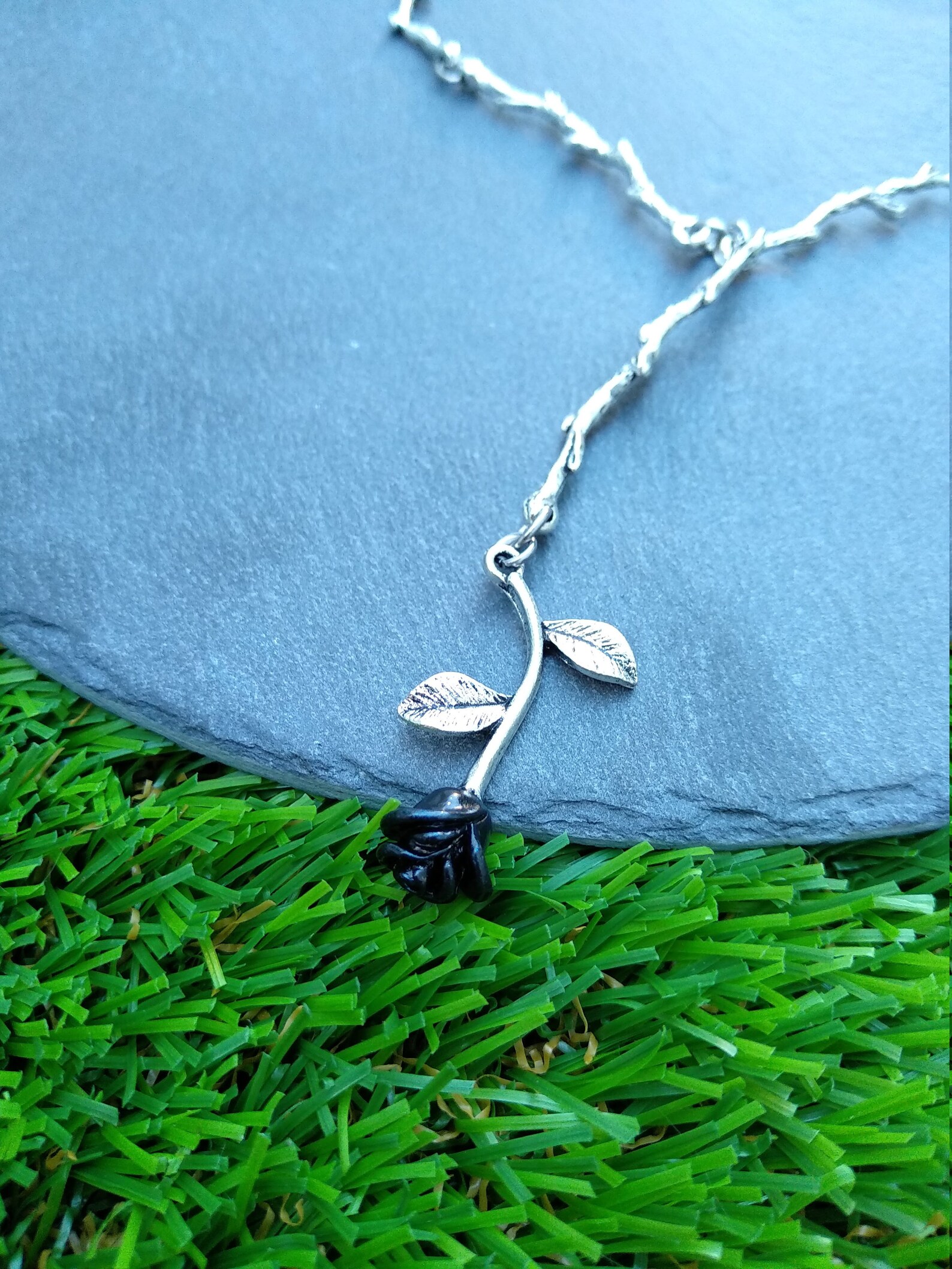 Black Rose Necklace Silver Y Necklace Dainty Branch Necklace Etsy