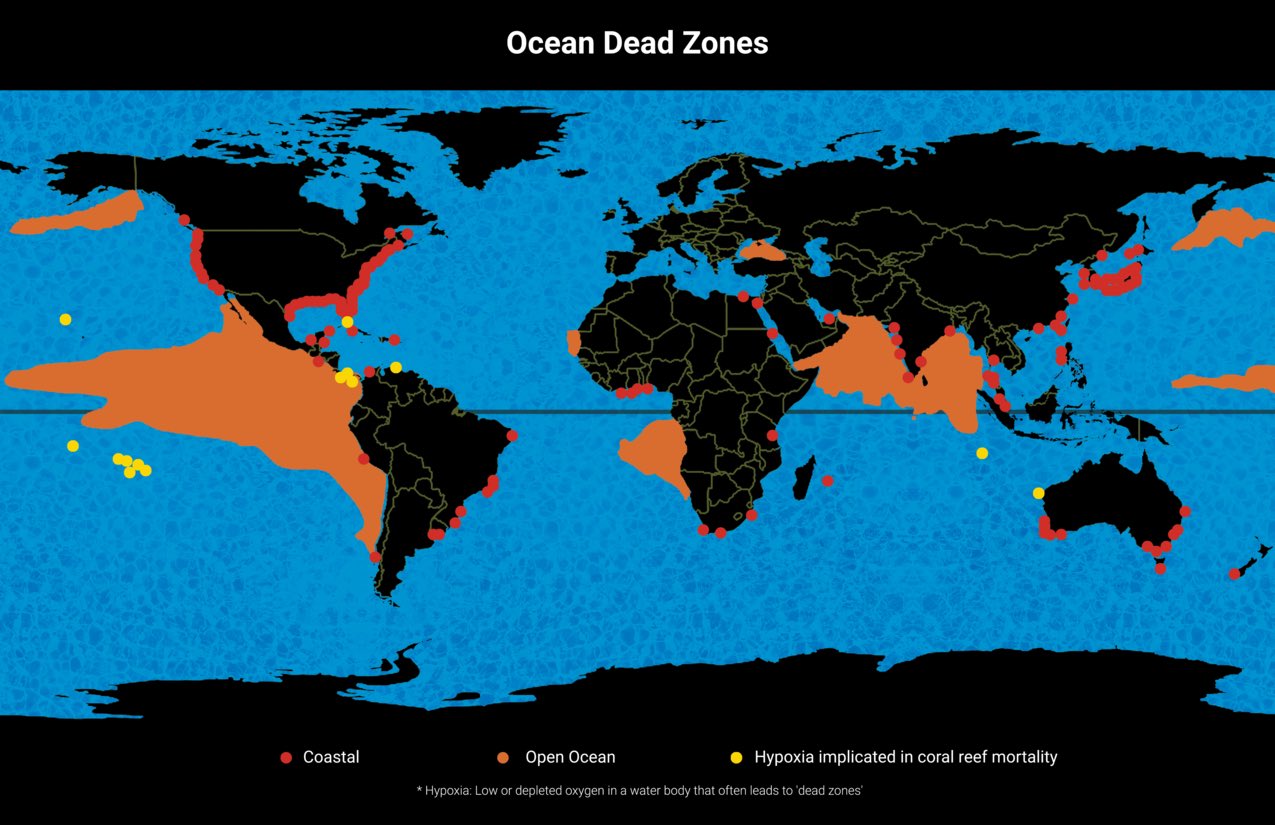 What Are Ocean Dead Zones? Definition, Causes, and Impact Ocean Dead Zone Map , the rest of the world fares no better—there are now 405 identified dead zones worldwide, up from 49 in the 1960s—and the world's largest dead zone remains the baltic sea, whose bottom. Less oxygen dissolved in the water is often referred to as a “dead zone” because most marine life either dies, or, if they are mobile such as. Ocean Dead Zone Map.