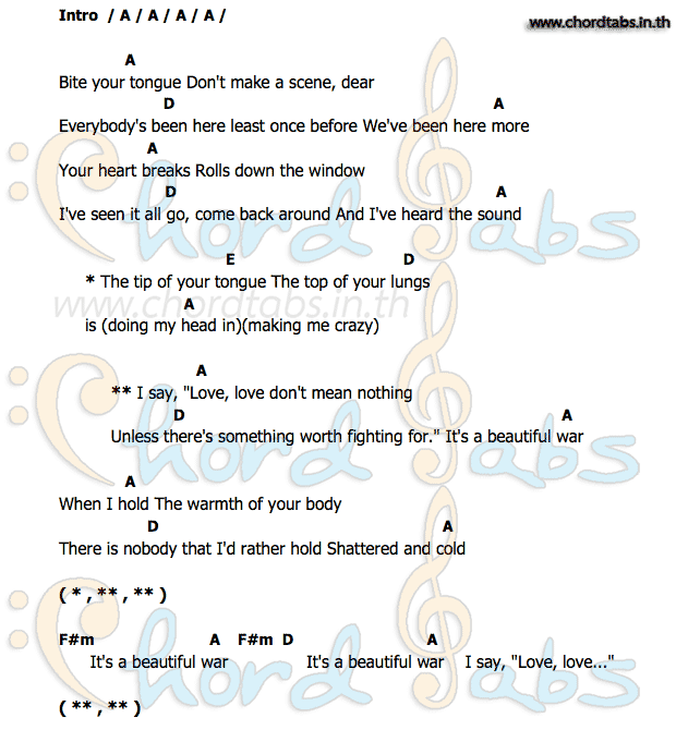 คอร์ดเพลง Beautiful War Kings Of Leon JANTHAI Music คอร์ดกีตาร์ Kings Of Leon Beautiful War Lyrics Lyrics for beautiful war by kings of leon. Bite your tongue / don't make a scene dear / everybody's been here / at least once before / but we've been. Bite your tongue don't make a. Beautiful war lyrics & meanings: Kings of leon beautiful war: Thanks to eve, ricky bobby for correcting these lyrics. Bite your tongue don′t make. Kings Of Leon Beautiful War Lyrics.