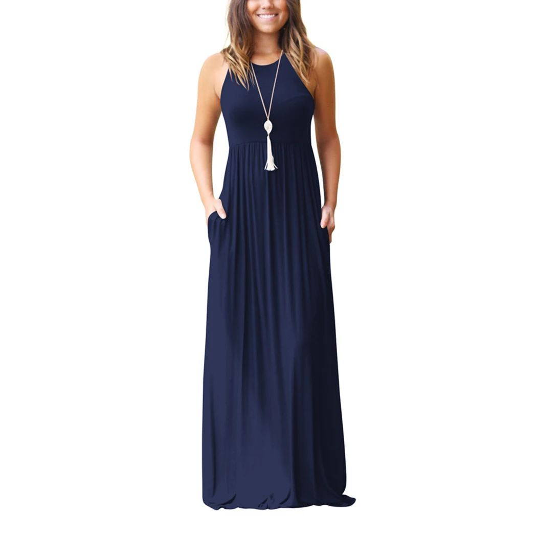 Casual Summer Maxi Dress Party Women Plain Long Dresses Sleeveless