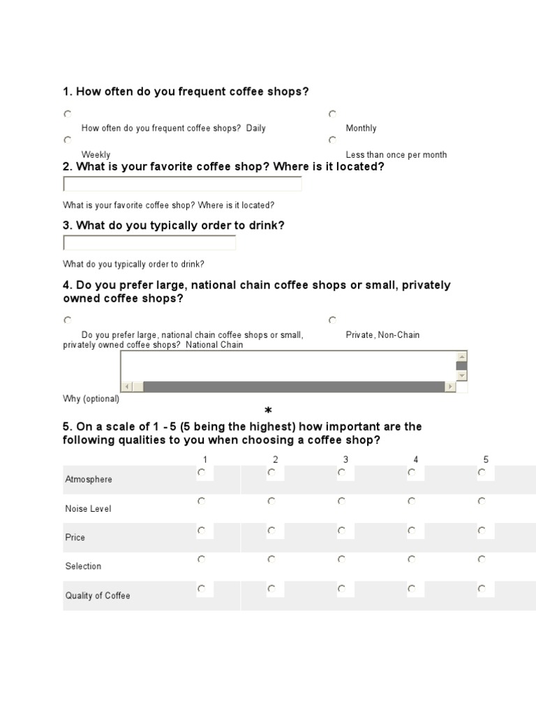 questionnaire on coffee Coffeehouse Coffee Coffee Survey Examples The purpose of this survey is to hear and recordopinions from consumers like yourself regarding coffee consumption. Free coffee survey questionnaire template. The café evaluation questionnaire template will bring the required. Simply customize the questions to match your coffee shop — then embed the coffee survey on your website, share it with a link, or have customers fill it out. Coffee Survey Examples.