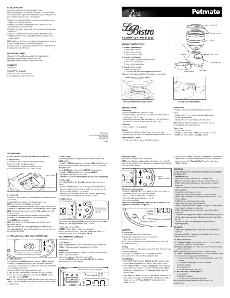 Petmate Auto Feeder Manual Petmate Automatic Feeder Manual to the new automatic feeder some pets may require a special adjustment period to acclimate to their new automatic feeder. Le bistro pet care product pdf manual. Automatic pet feeder with digital timer. Cat mate c300 pet care. view and download pet mate cat mate c300 instructions online. view and download petmate le bistro user manual online.. Petmate Automatic Feeder Manual.