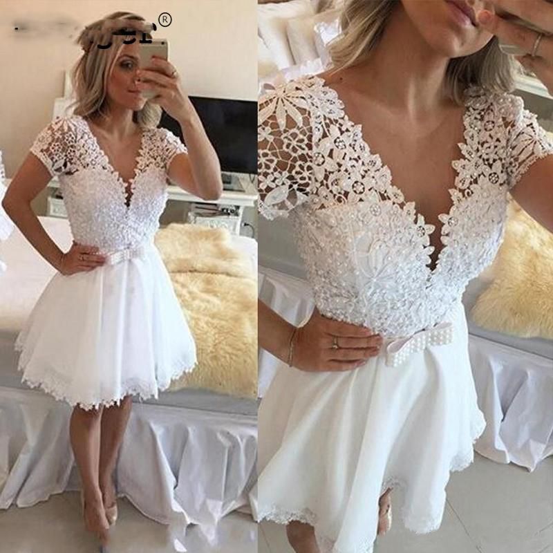White/Ivory Cocktail Dresses A Line V Neck Short Sleeves Short Lace