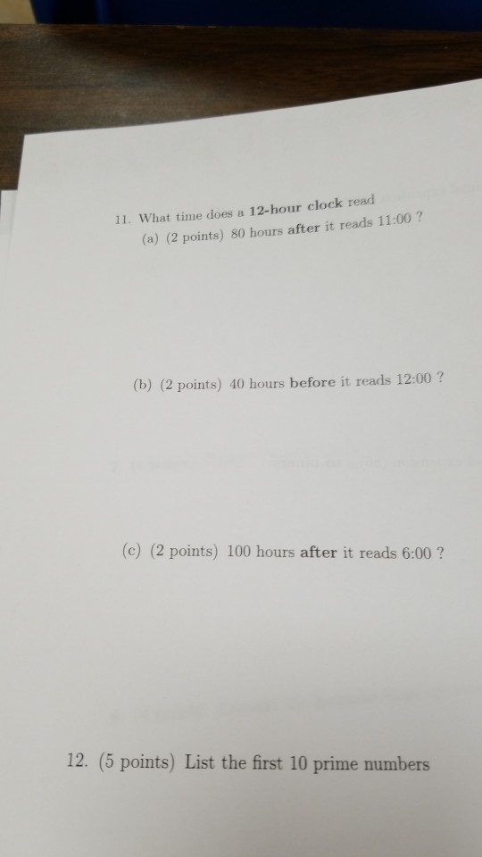 Solved 2. What time does a 12 hour clock read 90 hours after What Time Does A 12-Hour Clock Read B) 40 hours before it reads 12:00? Using a twelve hour clock, this is instead simply $t+n\equiv f\pmod {12}$. It uses two cycles of 12 hours in the morning (am) and afternoon (pm). To find the resultant time after. C) 100 hours after it reads 6:00?. If the current time is 2:00, and we want to know what the future. What Time Does A 12-Hour Clock Read.