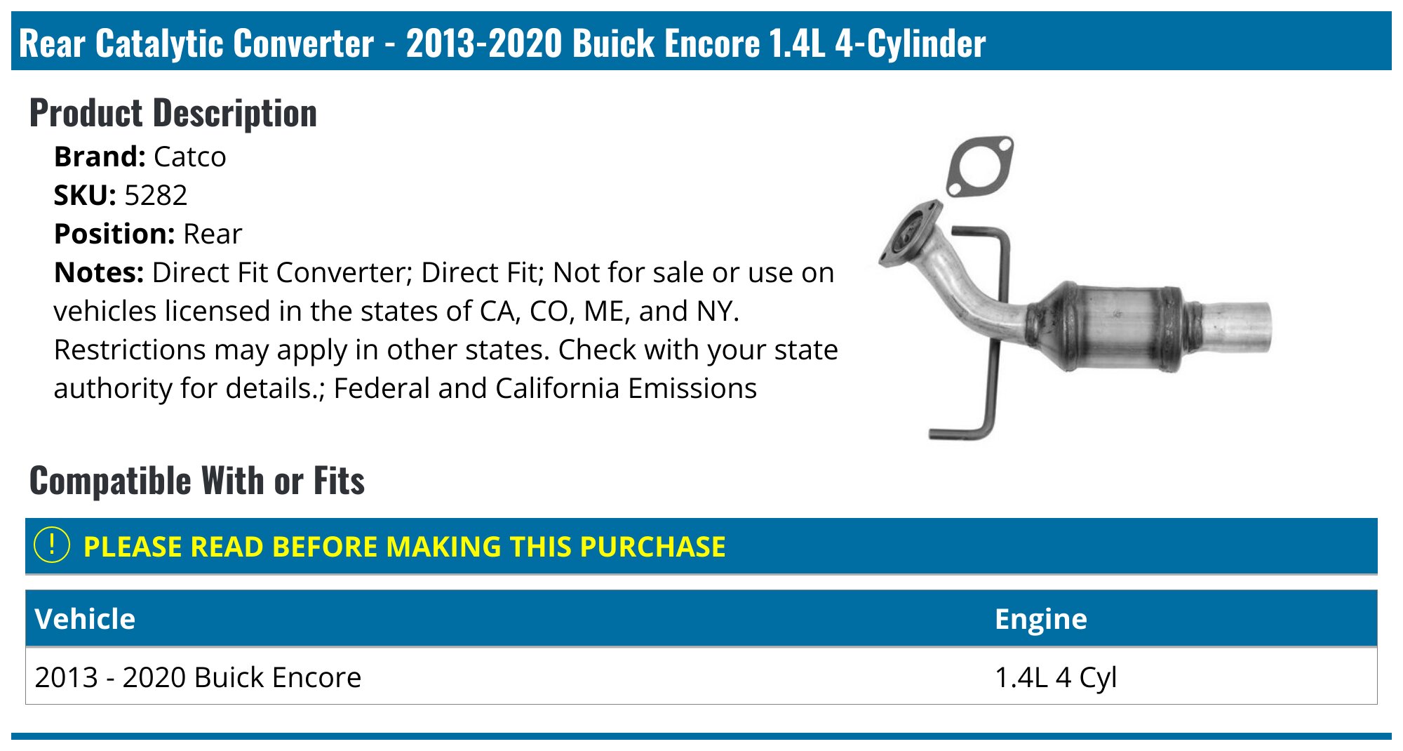 20132020 Buick Encore Catalytic Converter Catco 5282 Rear