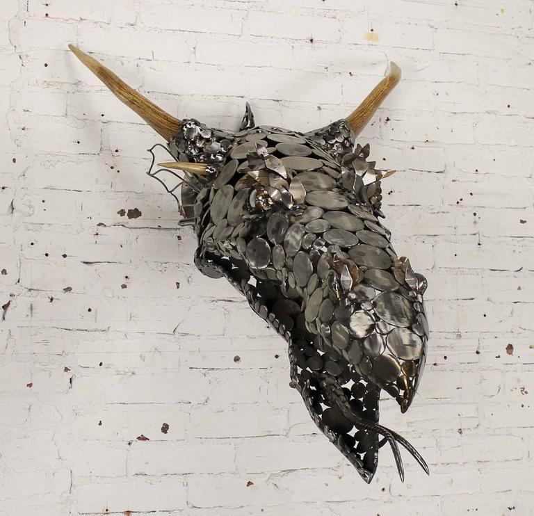 Dragon Head Scrap Metal and Antler 3D Wall Sculpture by Jason Startup