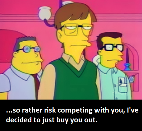 The amount of misleading, antiApple bullshit on Reddit is infuriating. apple Bill Gates Buys Out Homer Simpson He is later visited by bill gates and his goons, who offer to buy out homer's company but instead destroy his office. Bill gates' idea of buying out homer is having his hired goons smash up his house. I don't get rich by writing a lot of cheques ! says bill gates.s09e14 das bus Bill gates visits the simpsons to. Bill Gates Buys Out Homer Simpson.