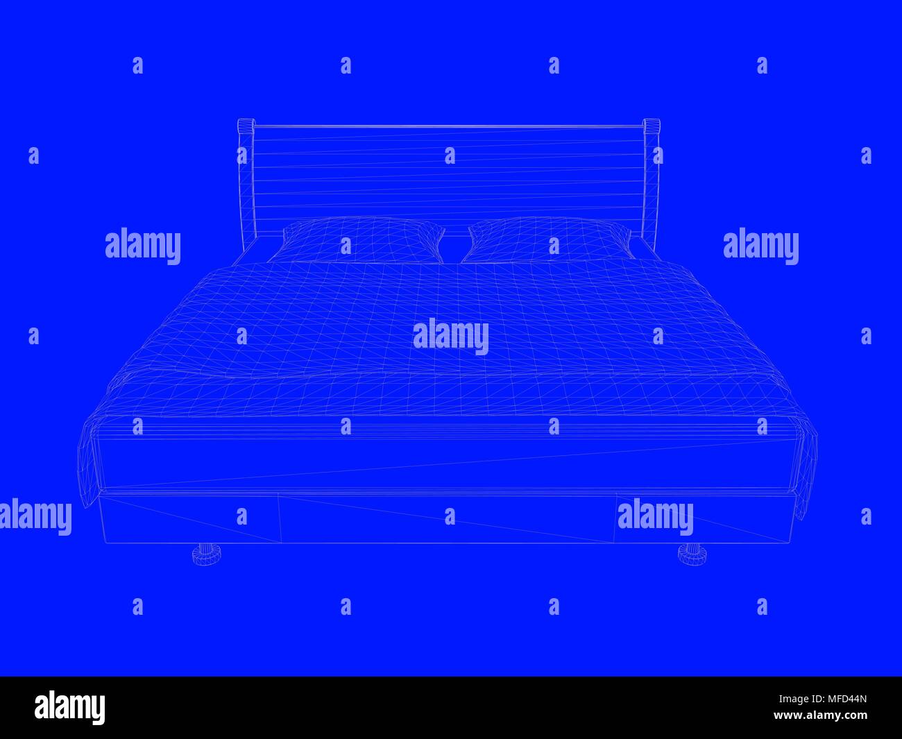 3d rendering of a bed blueprint as lines on a blue background Stock