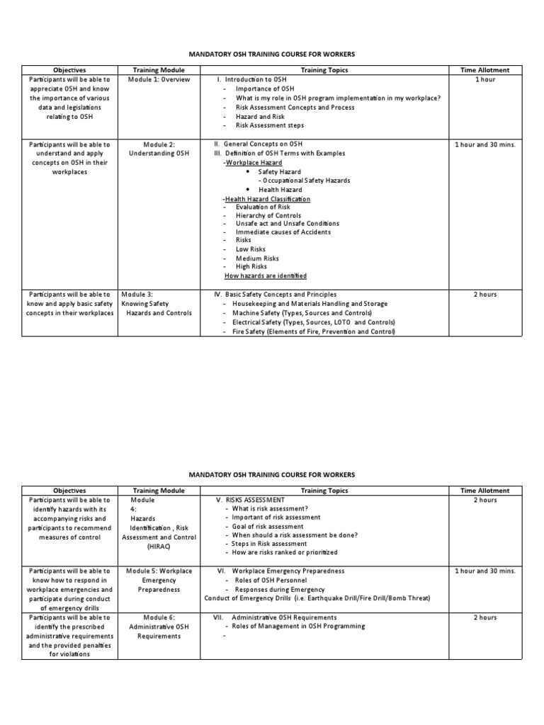 MANDATORY OSH TRAINING COURSE FOR WORKERS PDF Risk Risk Assessment Mandatory Osh Training For Workers We create training materials, distribute training grants to nonprofit organizations, and. It is a comprehensive seminar that covers various topics such as safety precautions, health and sanitation, emergency response, and labor laws. The osh law also states in. Many osha standards explicitly require the employer to train employees in the safety and health aspects of their jobs. By familiarization themselves. Mandatory Osh Training For Workers.