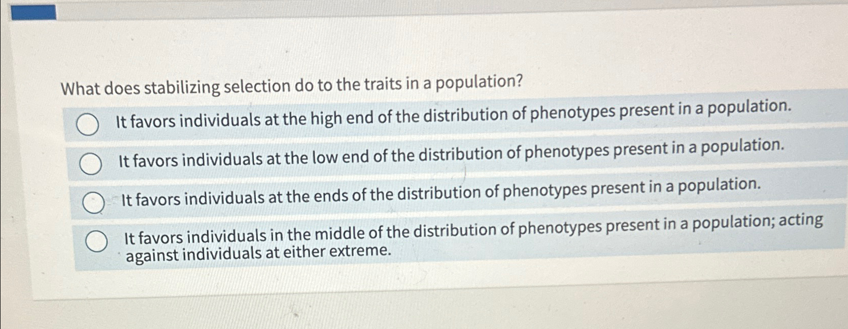 Solved What does stabilizing selection do to the traits in a