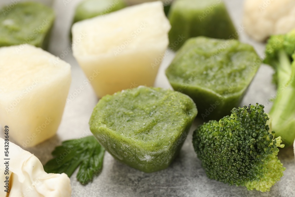 Frozen cauliflower and broccoli puree cubes on light grey table