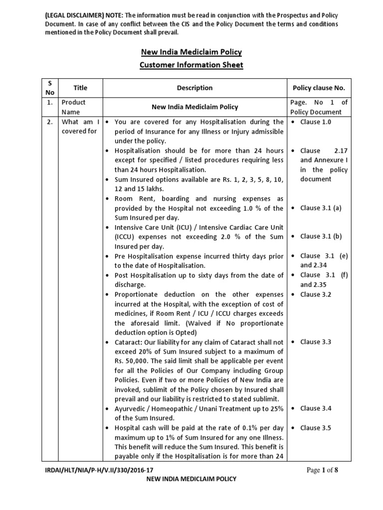 Customer Information Sheet New India Mediclaim Policy PDF Insurance