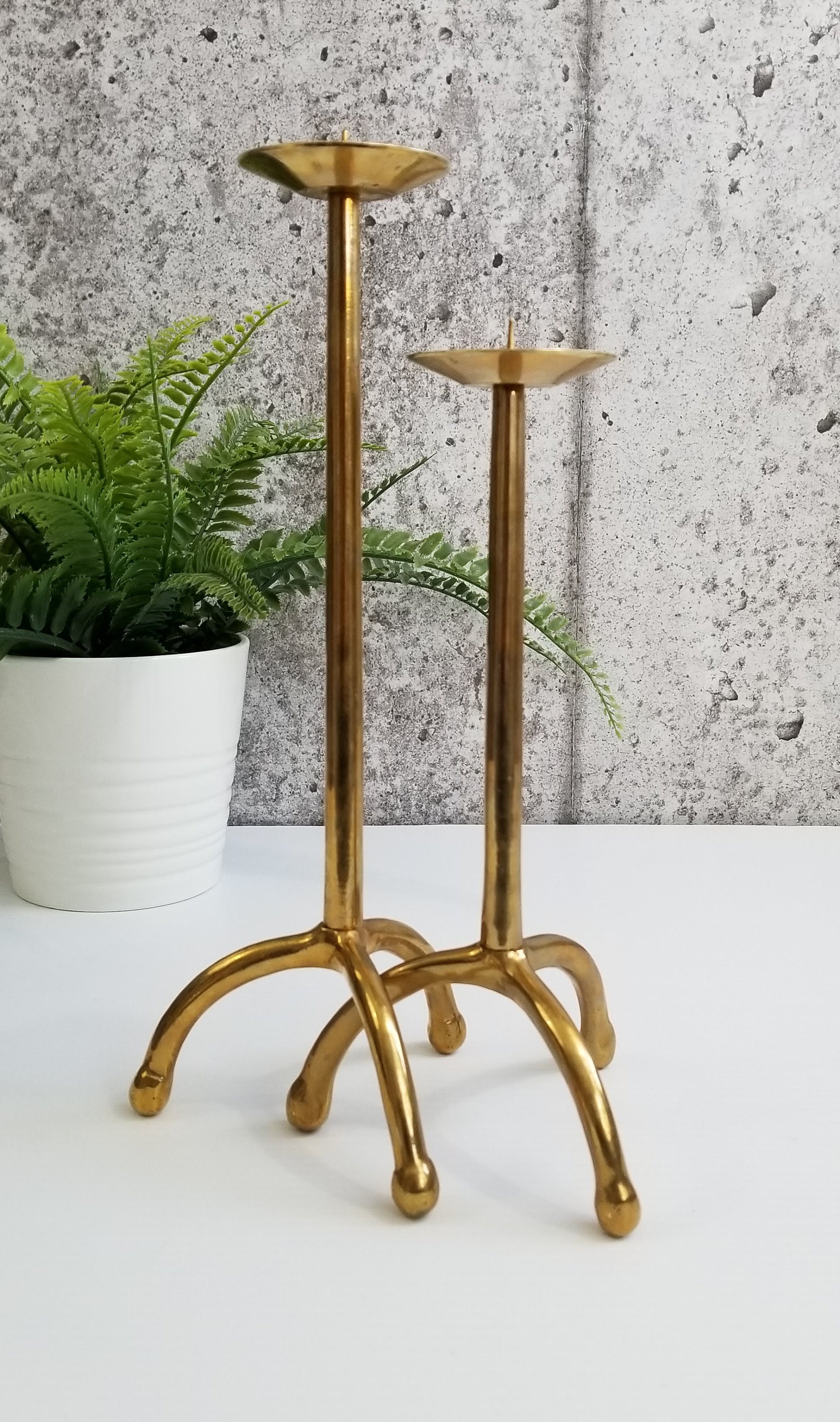 Pair Brass Candle Holders, Tall Graduating, Pillar Candles, Spider Legs