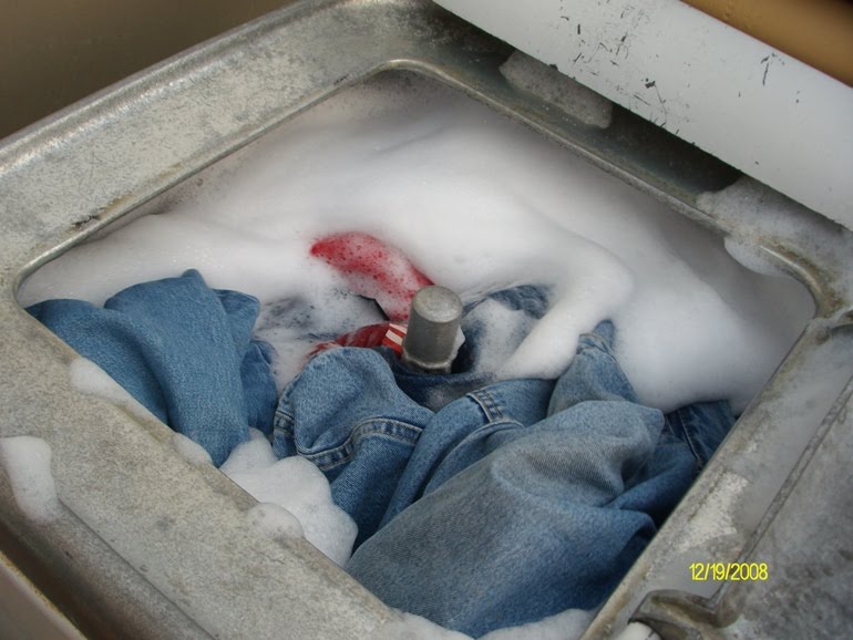 Doing my best for Him Washing laundry in a wringer washer outdoors.