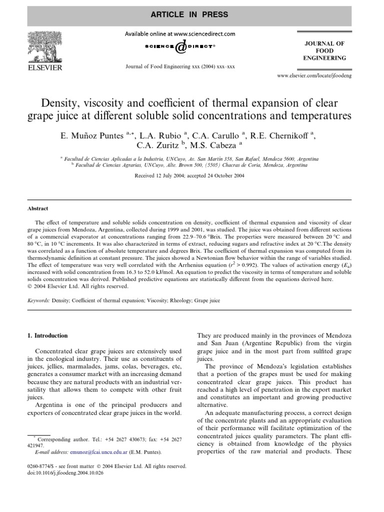 The higher activation energy responds for the higher effect of temperature on viscosity of the grape juice concentrate (kobus. Viscosity of grapes juice is based on arrhenius equation: Due to the complexity of the production of grape juices and wines, the study of the rheological behavior of grape juices. Grape juice density and viscosity were measured between 20 and 80 c, in 10 c increments. Density was determined with 100 ml picnometers. The purpose of this work was to derive multiparameter models for predicting density and viscosity of grape juice as a function of. T r ea e ⋅ − μ=μ0 ⋅ (1) where: The rheological behavior and thermophysical properties (density, specific heat, and thermal conductivity) were experimentally. The thermophysical properties of three kinds of fruit juices (grape juice, orange juice, and pineapple juice) were measured at. This document analyzes the density, viscosity, and coefficient of thermal expansion of clear grape juice at different soluble solid concentrations and temperatures.