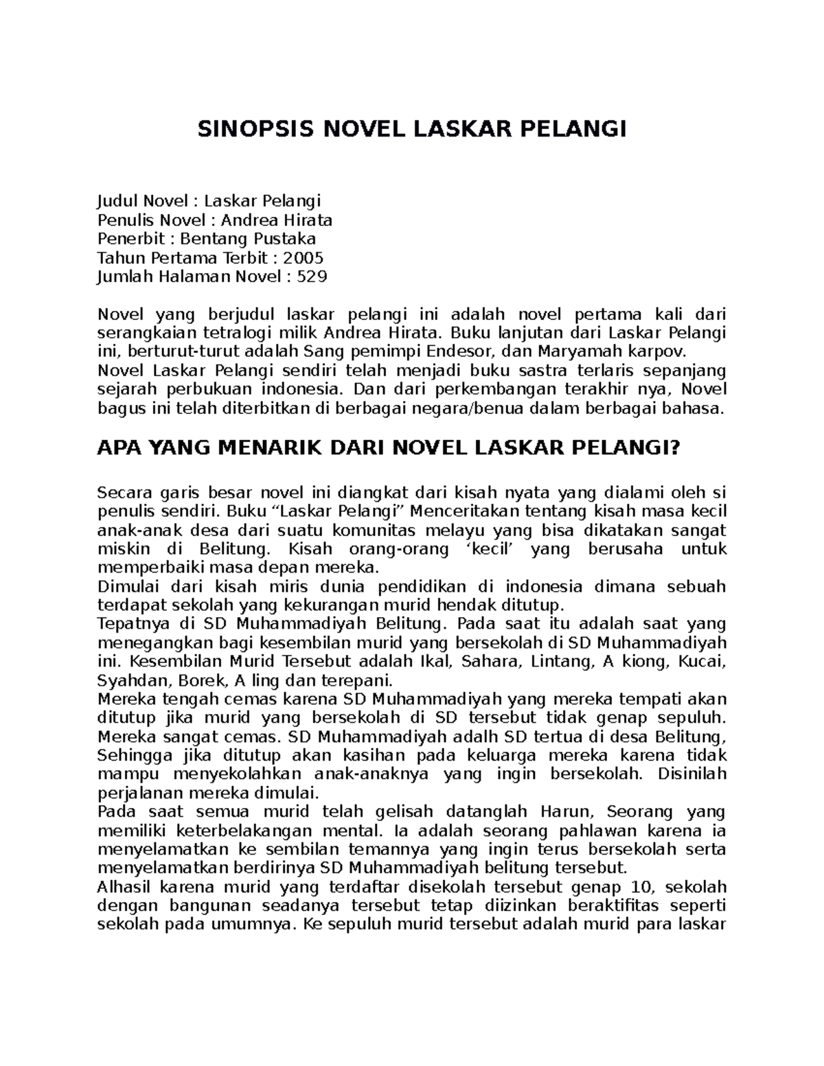 Tugas bahasa indonesia SINOPSIS NOVEL LASKAR PELANGI Judul Novel