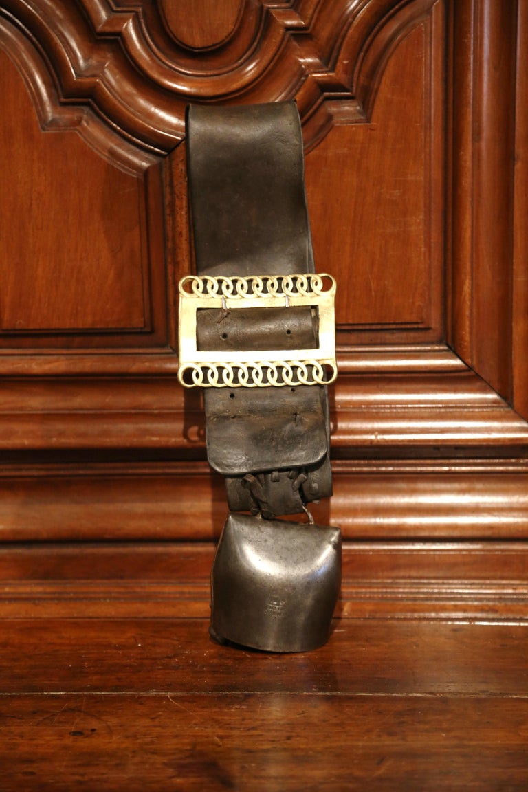 19th Century French Signed Cow Bell with Original Leather Collar and