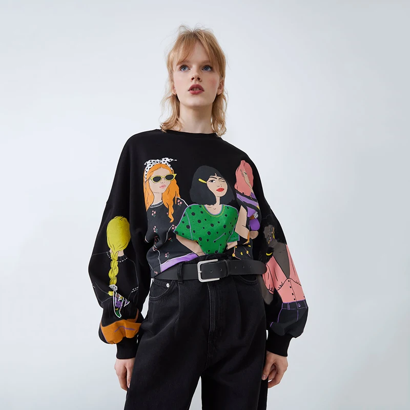 Trendy Za Black Girl Print Sweatshirt Women Round Collar Puffy Long