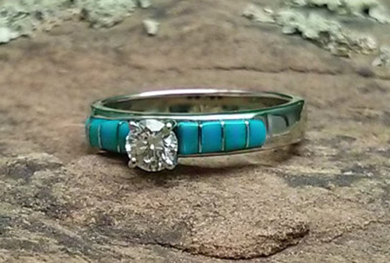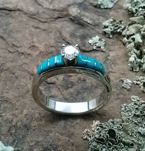 Womens Engagement Ring 1CT Moissanite w/ Turquoise Inlay Engagement Rings Diamond And Turquoise You can opt for two styles of turquoise: This stunning engagement ring features a round brilliant cut diamond prong set at the top, with a cabochon cut turquoise bezel set on each shank shoulder, as well as diamonds and custom hand. Our solid turquoise rings include engagement rings and wedding bands. In our collection, you'll find affordable engagement rings with. Engagement Rings Diamond And Turquoise.