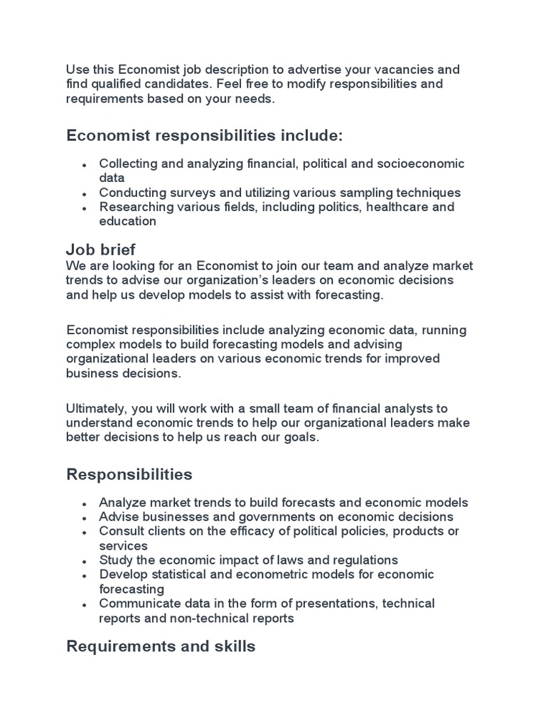 Job Description Economist Template . Economists study and analyze how societies, businesses, and individuals allocate resources, make decisions, and interact in the. They need to have the. Write papers for academic journals and other media. We have included economist job description templates that you. Ready to hire an economist? Economists employ knowledge of economic theories and concepts in analyzing trends and providing quality advice to decision makers. Advise individuals, government and businesses on economic subjects. Today, we present a comprehensive economist job description template, designed for effortless posting on job boards or career sites. To write an effective economist job description, begin by listing detailed duties, responsibilities and expectations. This post provides detailed information on the. Check out and use our examples of economist job. Economist job description template when you’re hiring an economist, it’s essential to find someone who will give your organization a competitive edge.