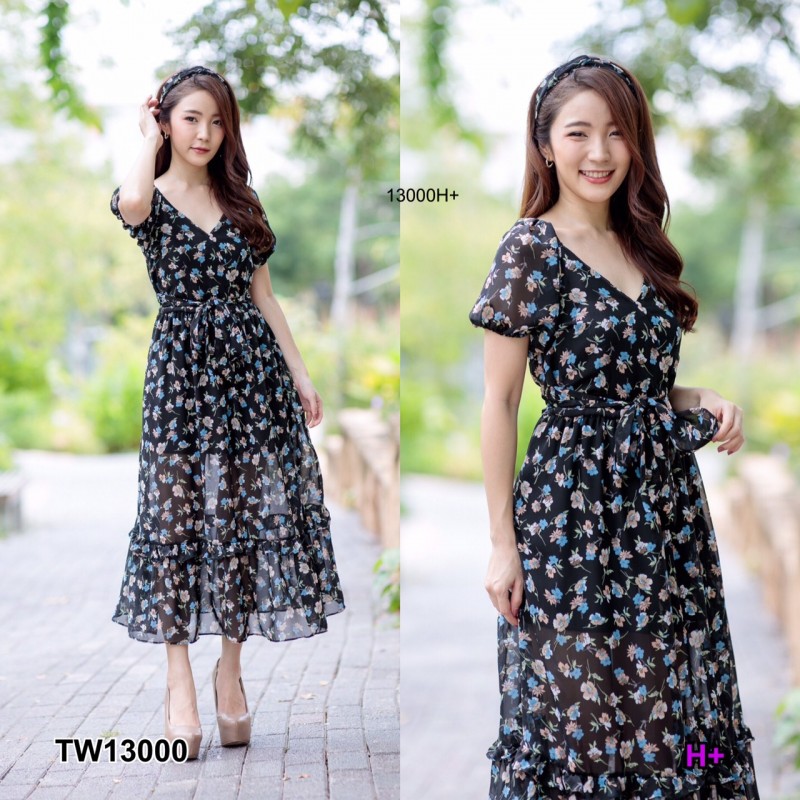 MM13000 เดรสชีฟองลายดอก + ยางโพกผม Floral chiffon dress + hair band ThaiPick