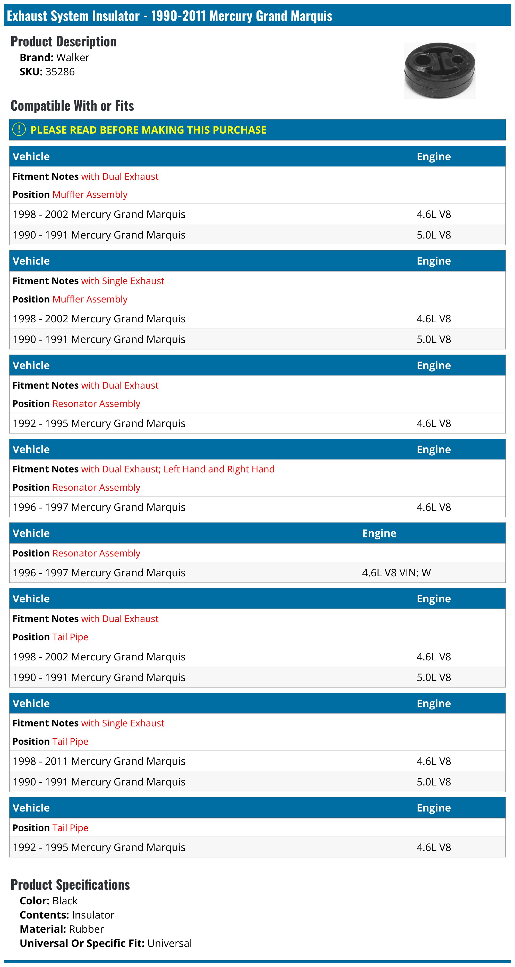 19902011 Mercury Grand Marquis Exhaust System Insulator Walker 35286