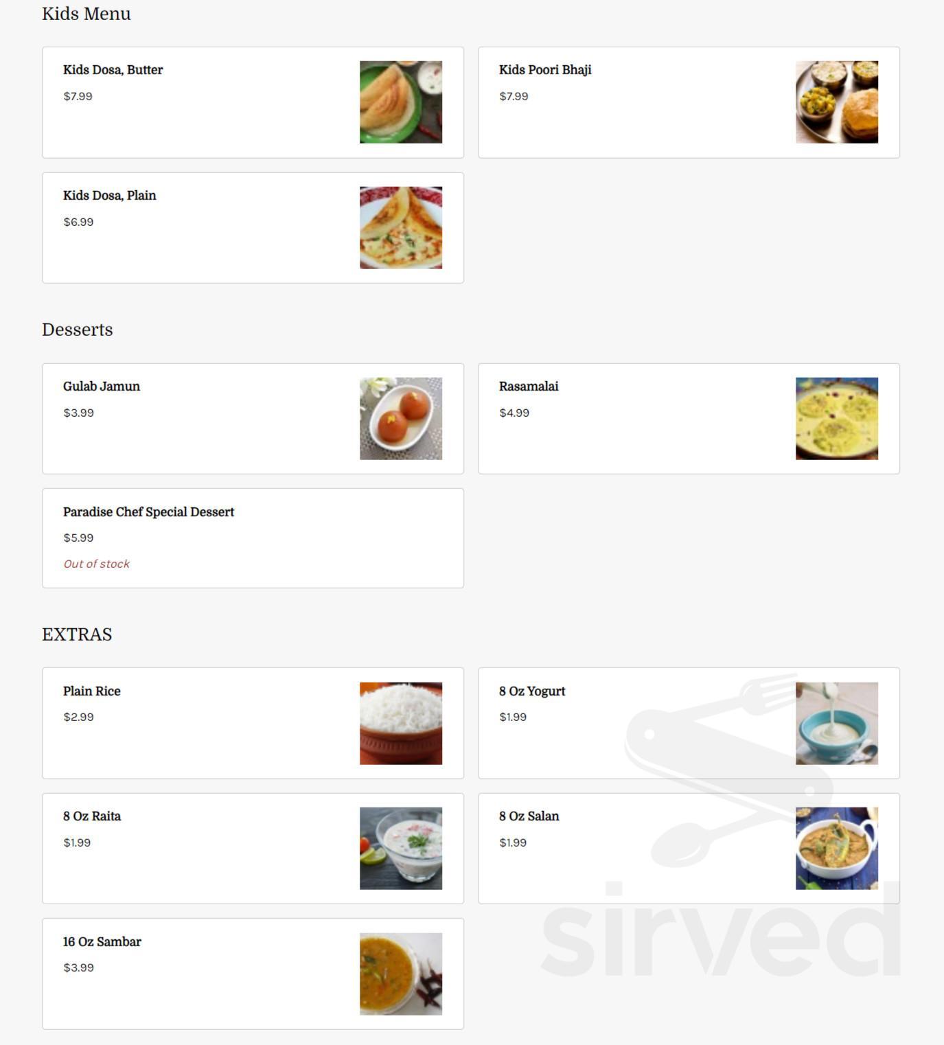 Paradise India Cuisine menu in Morrisville, North Carolina, USA