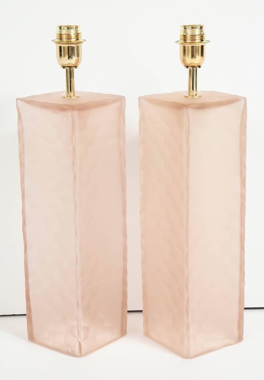 Pair of Italian Blush Pink Solid Murano Glass Textured Block Lamps at