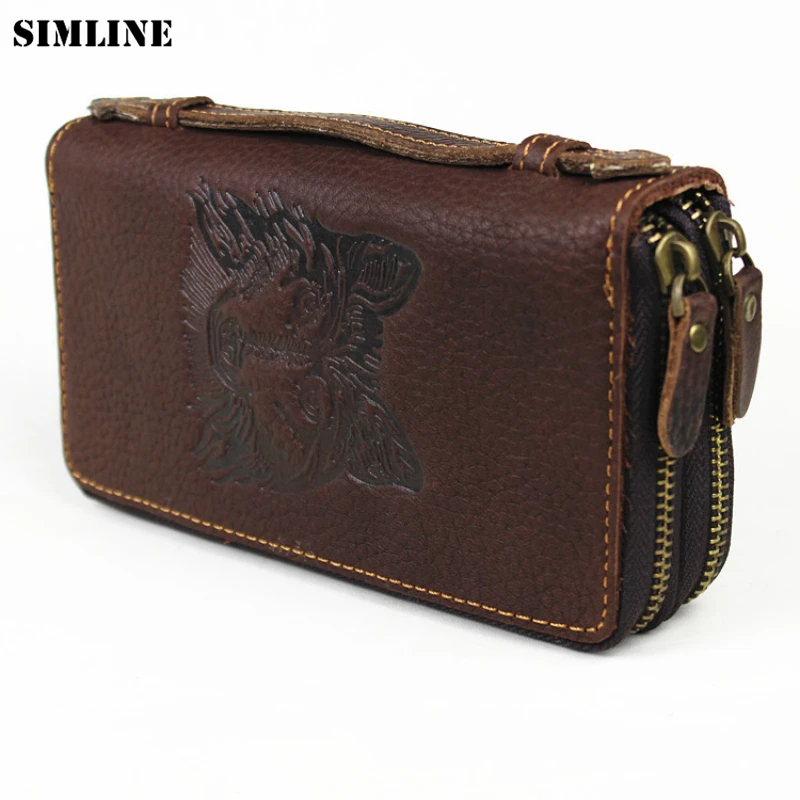 SIMLINE Vintage Genuine Cow Leather Men Clutch Wallet Men's Long Double