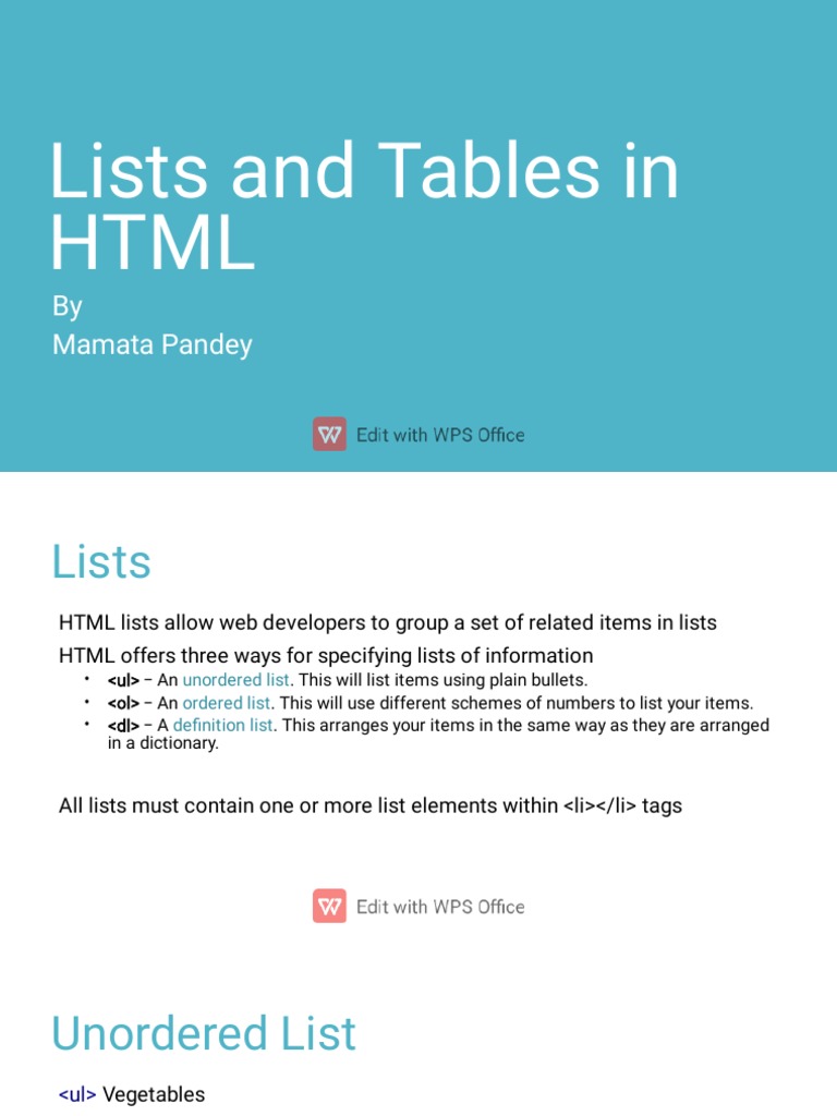 Lists and Tables in HTML Ordered List And Unordered List In Html Tables In Lists Html This article gets you started with html tables, covering the very basics such as rows and cells, headings, making cells span. Html tables organize and display data in a structured format, useful for comparing information like schedules, reports, and product. They are widely used for presenting information such as financial data,. This article gets you started with html tables, covering. Tables In Lists Html.