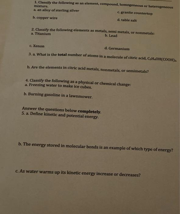 Solved 1. Classify the following as an element, compound,
