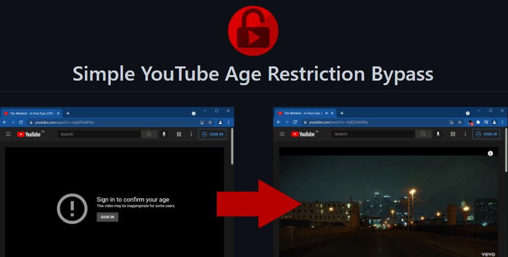 Getting started | privacy | development | contributors. Simple youtube age restriction bypass. Current version of this plugin does not work. New comments cannot be posted and votes cannot be cast. A very simple to use browser extension to bypass. Simple youtube age restriction bypass. Watch age restricted videos on youtube without login and without age verification 馃槑 A simple userscript to bypass youtube's age verification and view age restricted videos without having to sign in. Provide verbose output that clearly demonstrates the problem. A simple browser extension to bypass youtube's age verification, disable content warnings and watch age restricted videos.