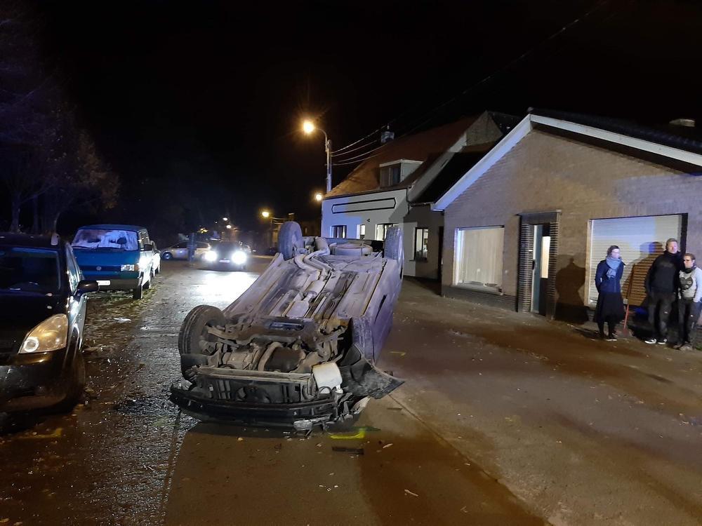 Auto knalt tegen geparkeerde wagen en belandt op zijn dak in Snaaskerke