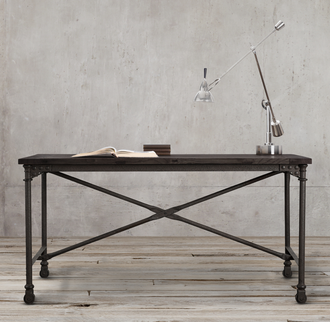 Reclaimed natural elm finish is crafted from antique. Giving its handmade and hand. The pairing of antiqued elm and distressed cast metal achieves the form meets function industrial appeal of flatiron. Industrial style elm and iron flatiron desk by the brand restoration hardware. The pairing of antiqued elm and distressed cast metal achieves the form meets function industrial appeal of flatiron. Tabletop is handcrafted of antiqued reclaimed elm on an cast iron frame with wheels. The pairing of antiqued elm and distressed cast metal achieves the form meets function industrial appeal of flatiron. Features antique reclaimed elmwood tabletop and solid steel. The pairing of antiqued elm and distressed cast metal achieves the form meets function industrial appeal of flatiron. A classic, retires style from rh.
