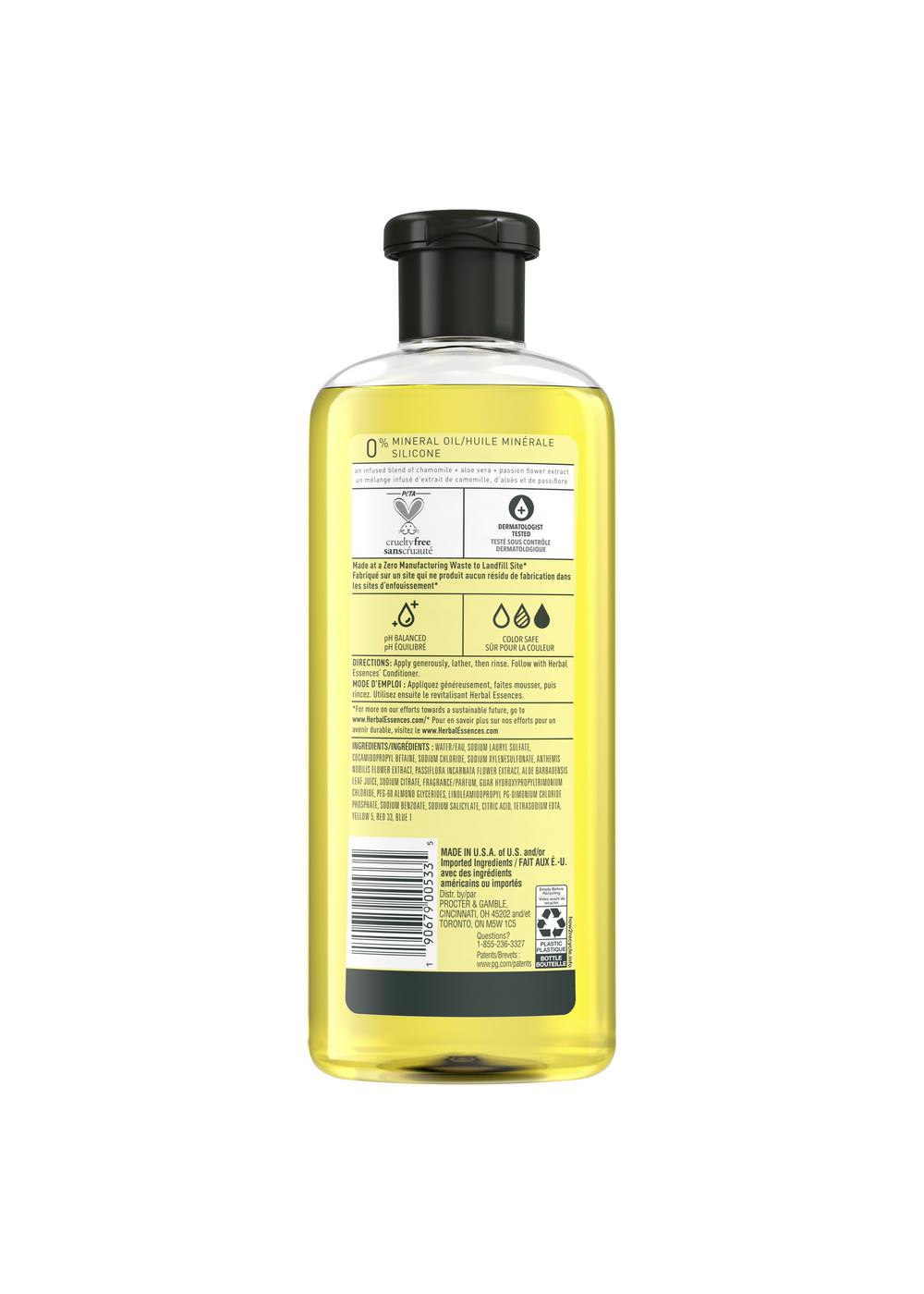 Herbal Essences Shine Chamomile Shampoo, 33.8 fl oz Shampoo Herbal Essences Chamomile Shine collection shampoo is infused with a blend of chamomile, aloe vera and passion flower. Indulge your hair with the shine shampoo with essence of chamomile, aloe vera and passion flower extracts to get brilliant shine and. Indulge your hair with herbal essences chamomile shine shampoo with an infused blend of chamomile, aloe vera and passion flower extracts to get. Shampoo Herbal Essences Chamomile.
